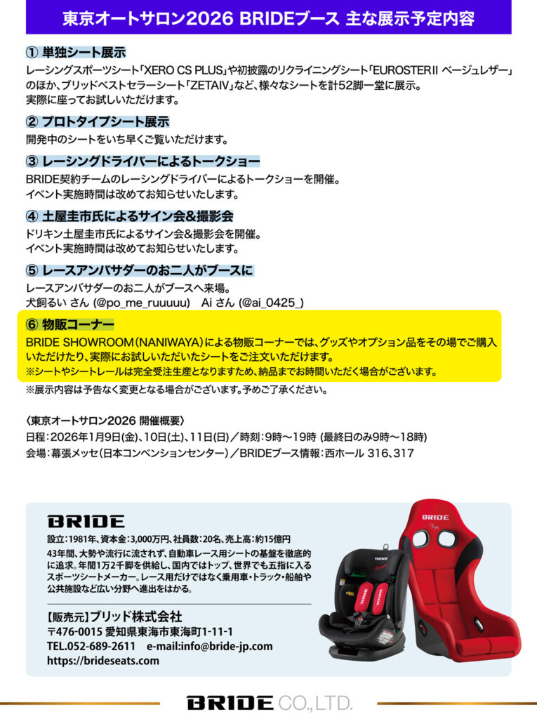 2026年1月9日(金)、10日(土)、11日(日)に行われる「東京オートサロン2026」にブリッドショールームが出張!ブリッド全商品を特別価格にて販売いたします!